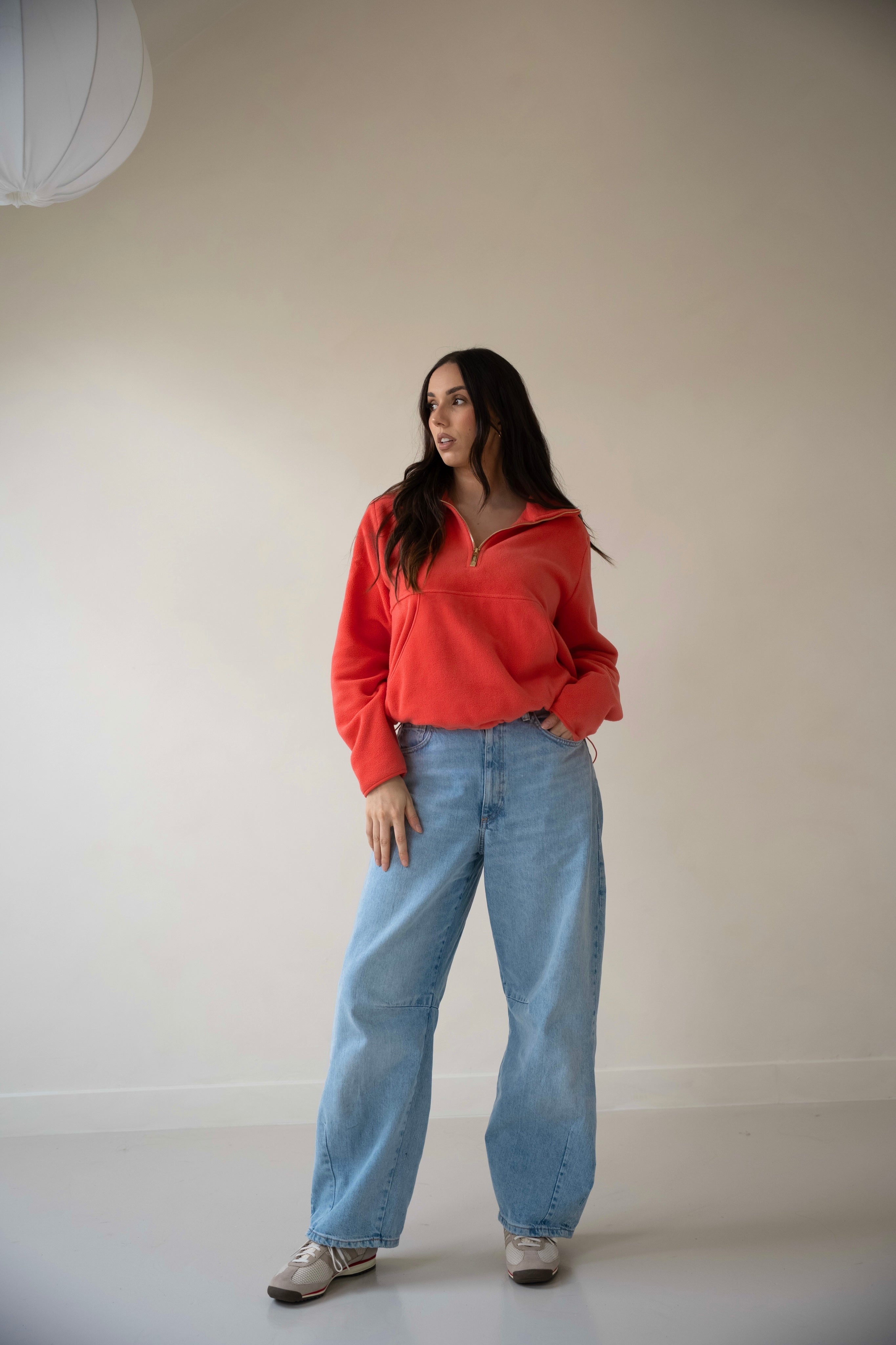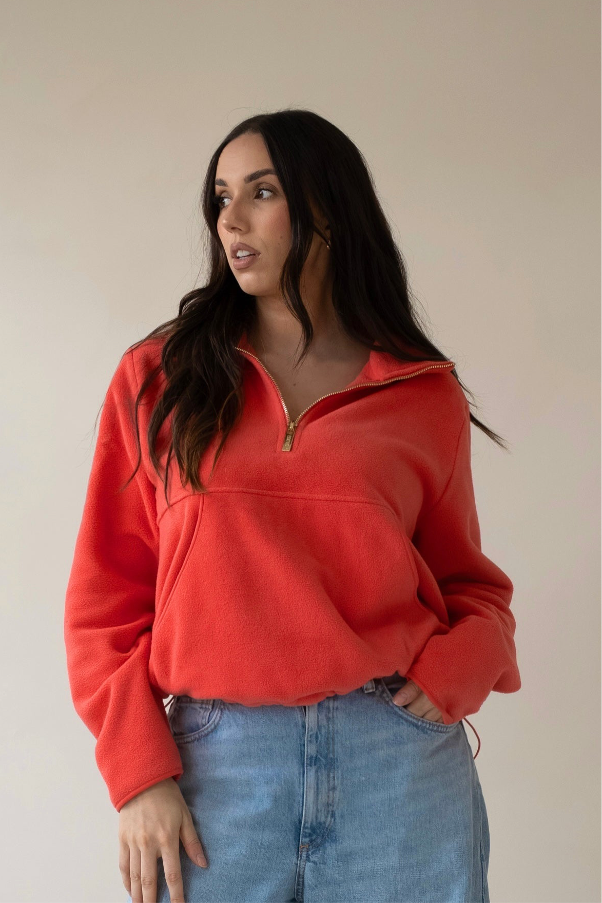 It features a sleek half-zip funnel neckline and a relaxed silhouette that flatters every figure. Thoughtful pocket details on either side add both function and style, while adjustable gold hardware drawstrings at the hem allow you to customise the fit to your mood — structured and cinched or easy and relaxed.