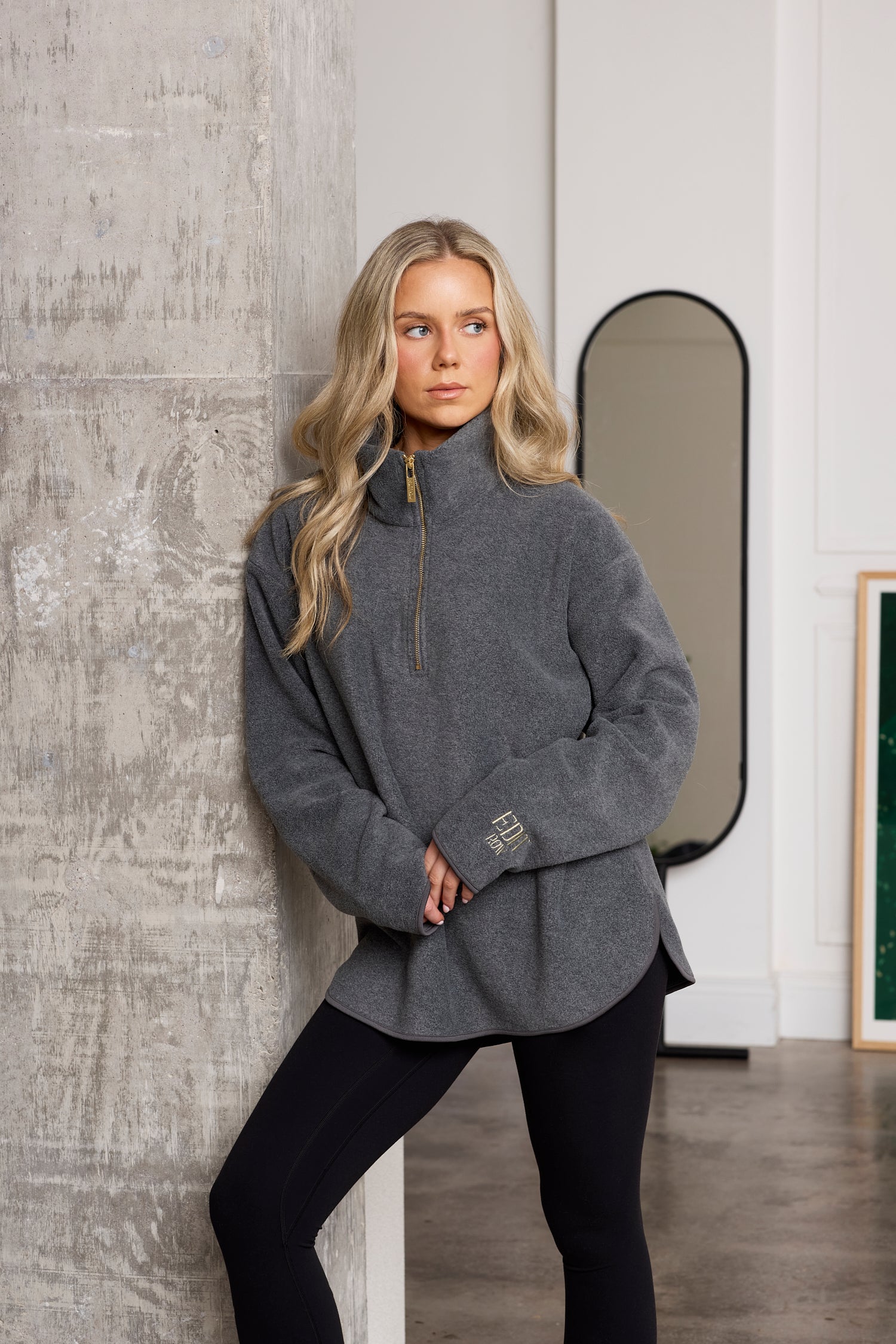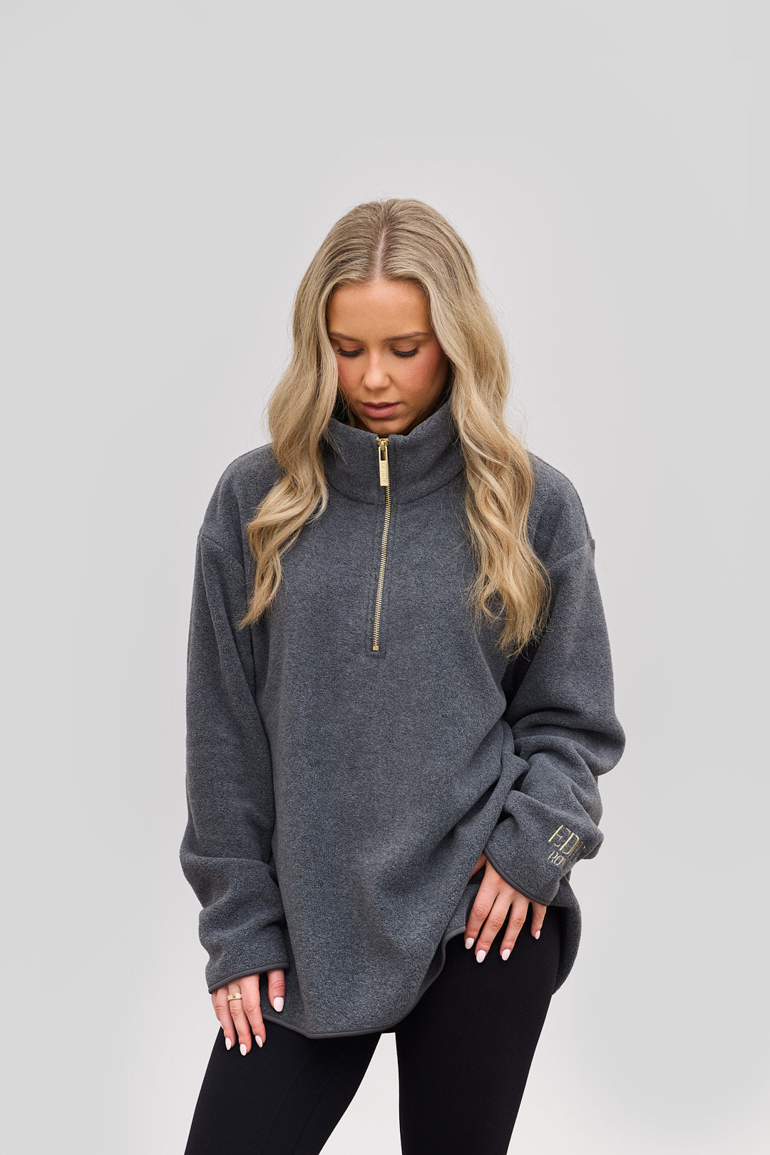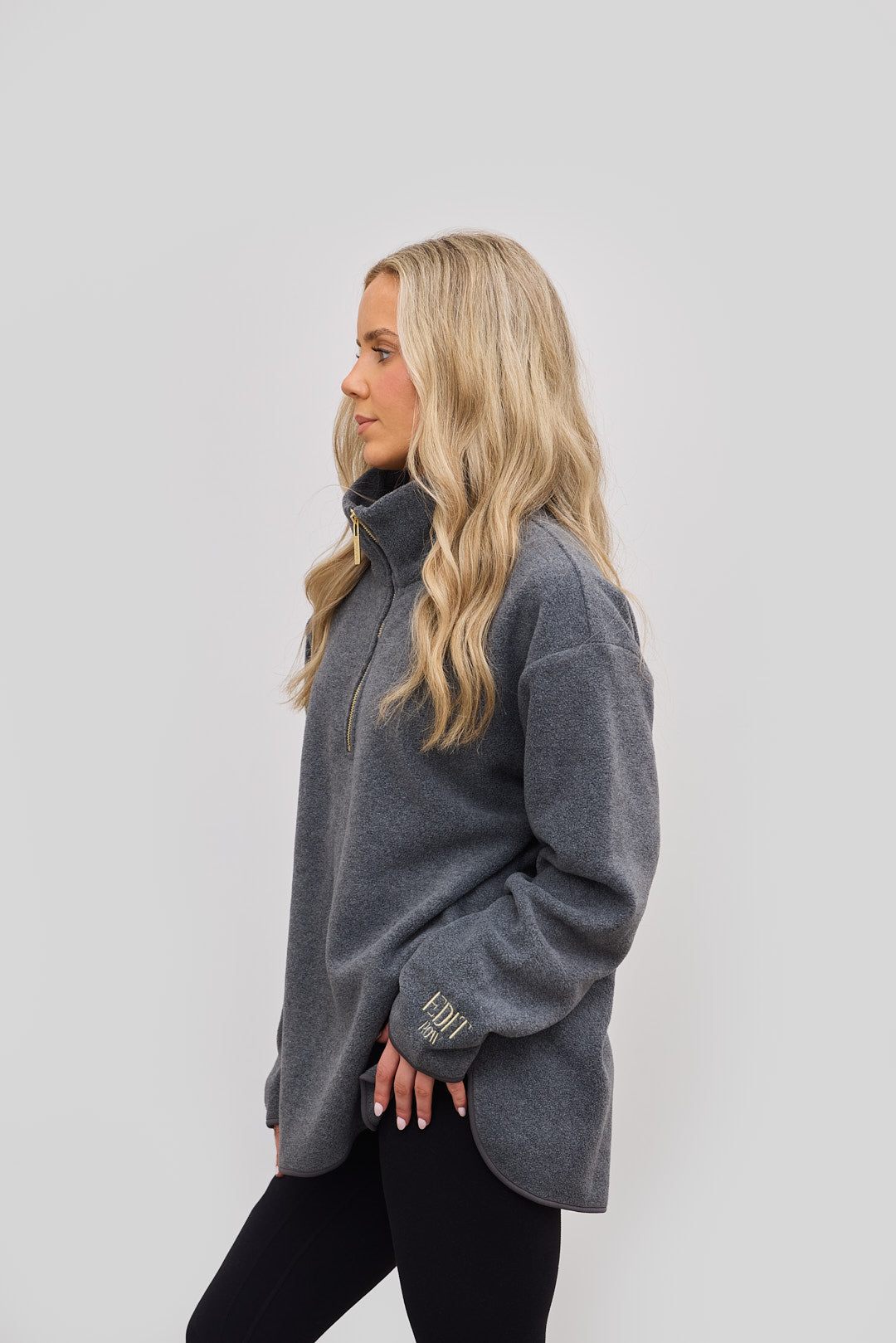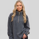 Crafted from ultra-soft, premium micro fleece, this piece features a sleek funnel half-zip neckline and a relaxed silhouette that flatters every figure. It’s a relaxed fit and comes in both a long version and a short version.