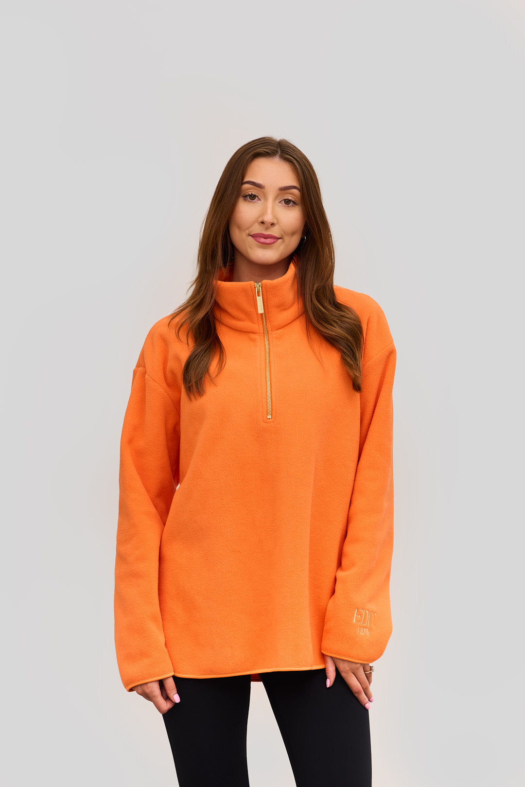 Crafted from ultra-soft, premium micro fleece, this piece features a sleek funnel half-zip neckline and a relaxed silhouette that flatters every figure. It’s a relaxed fit and comes in both a long version and a short version.