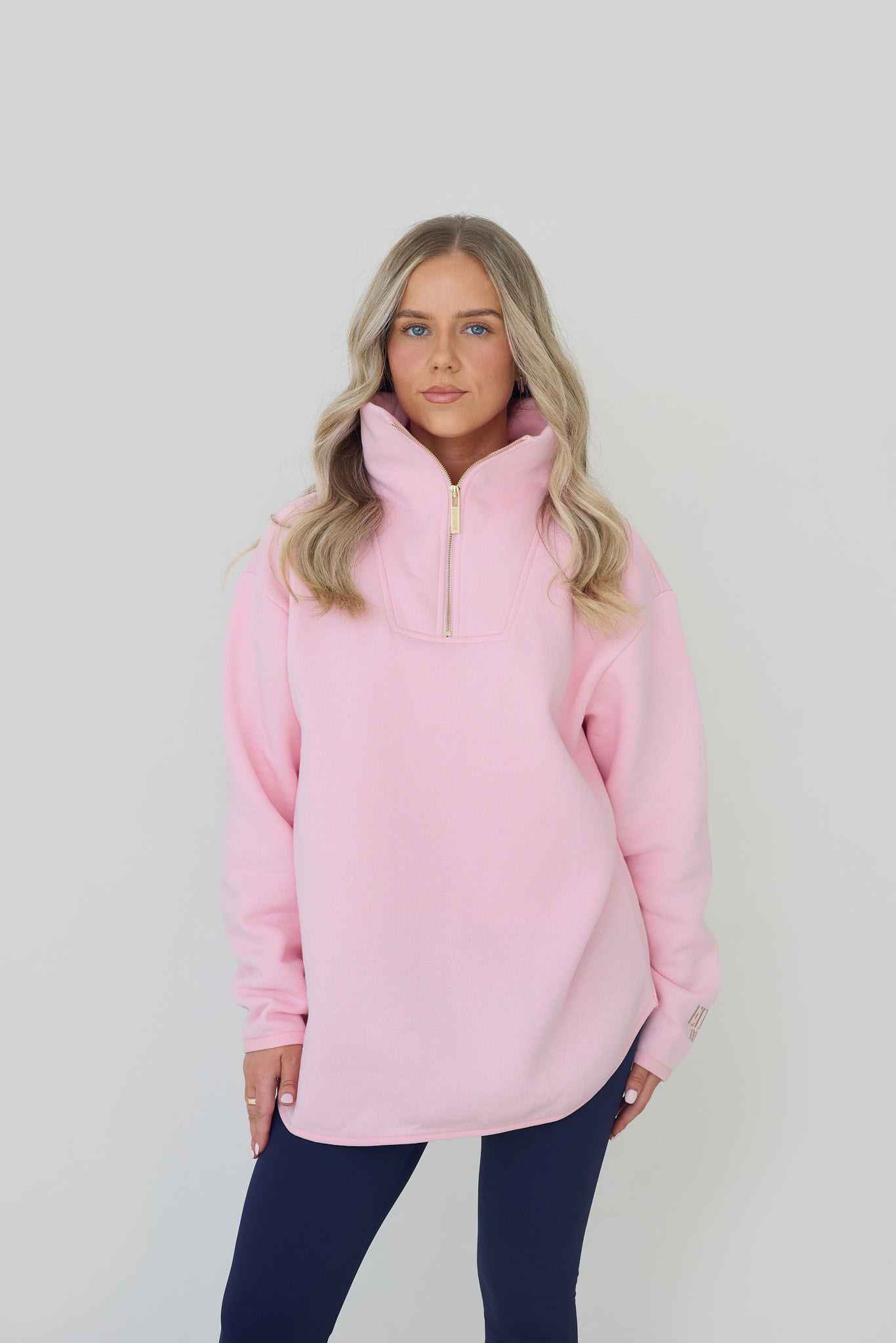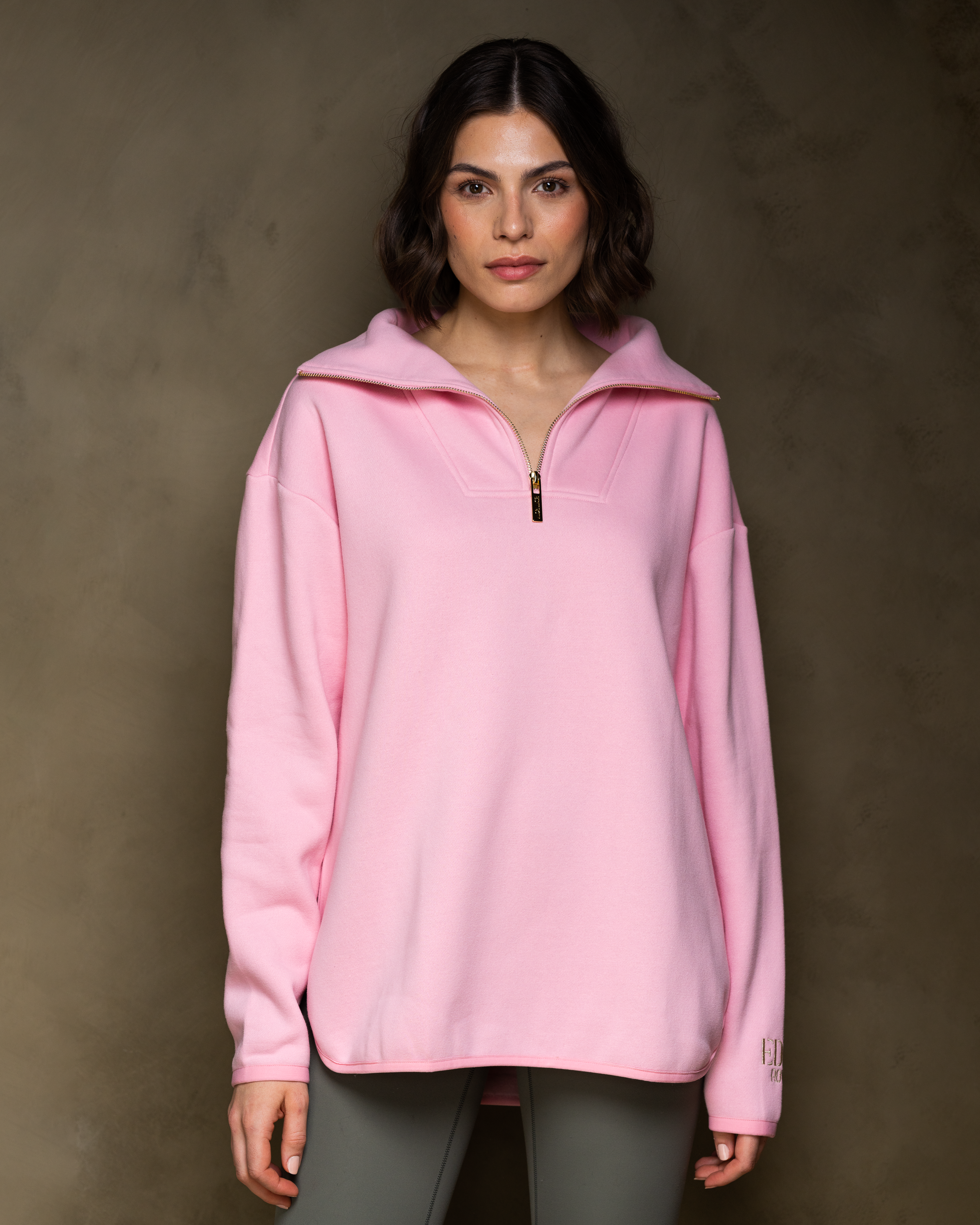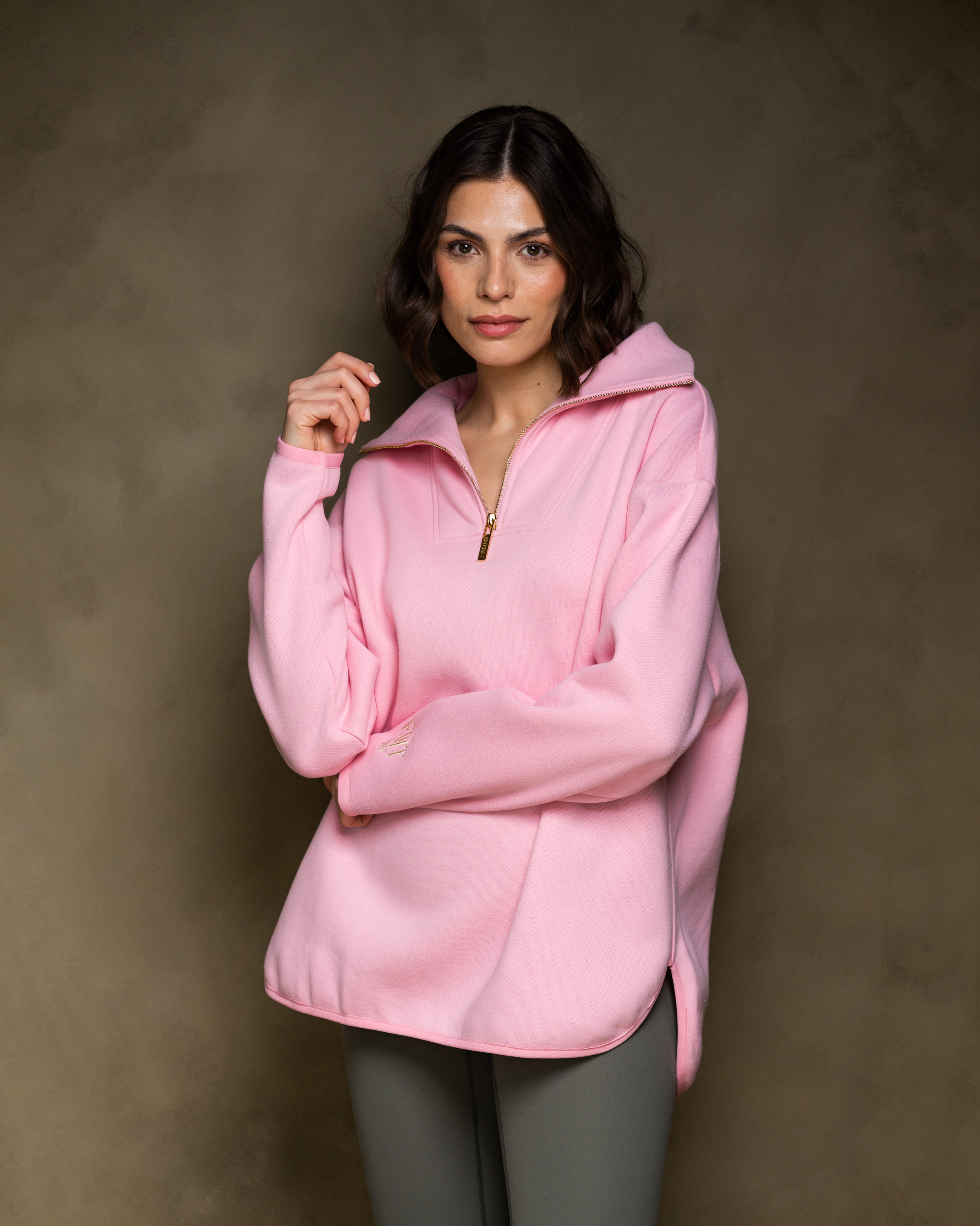 The Elle Funnel Neck reimagines relaxed refinement with its ultra-soft cotton construction, offering cloud-like comfort and timeless design. Anchored by a branded gold zip that glides smoothly along the front, the half-zip fastening allows for adjustable styling, while the high collar funnel neck adds a sleek, modern edge.