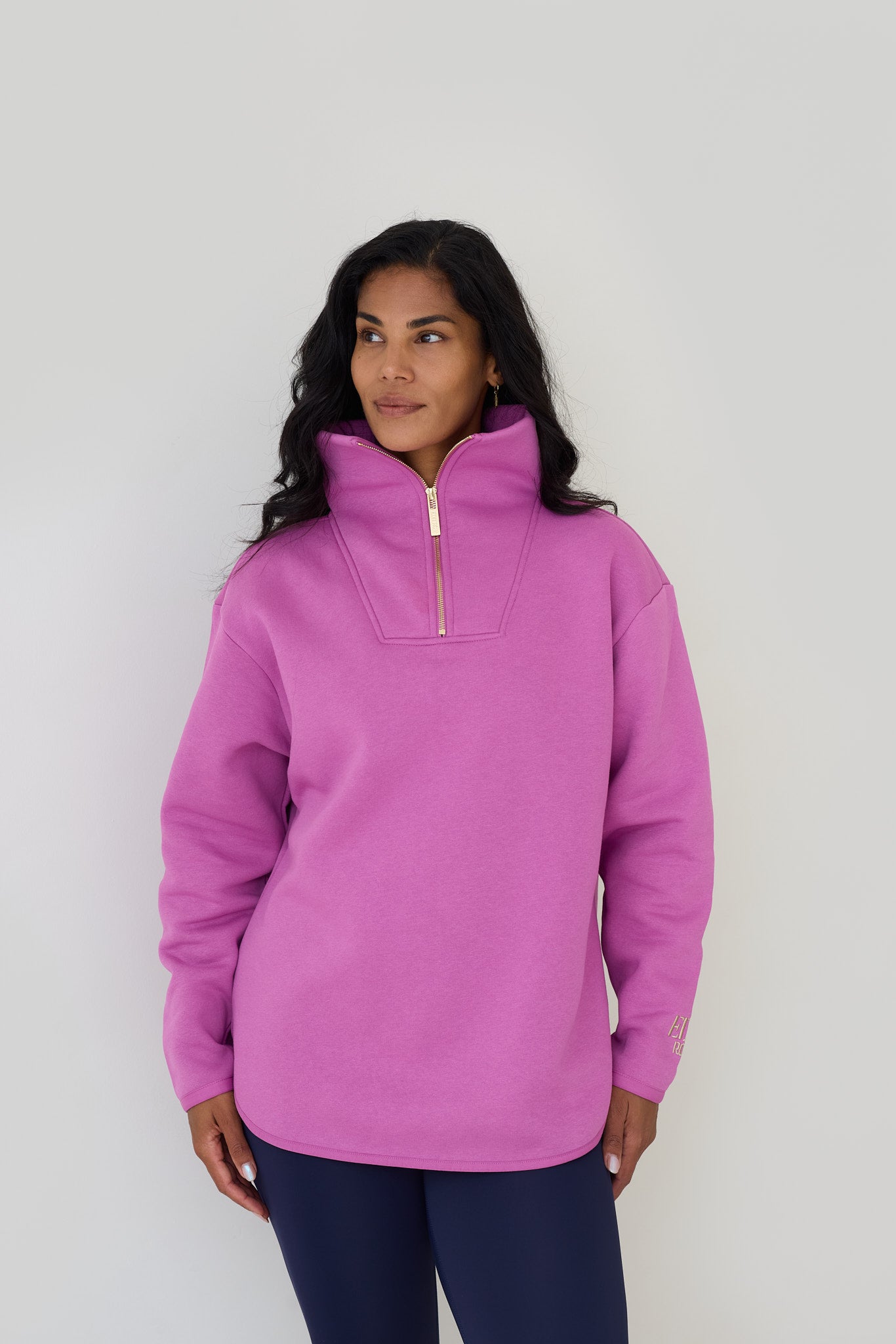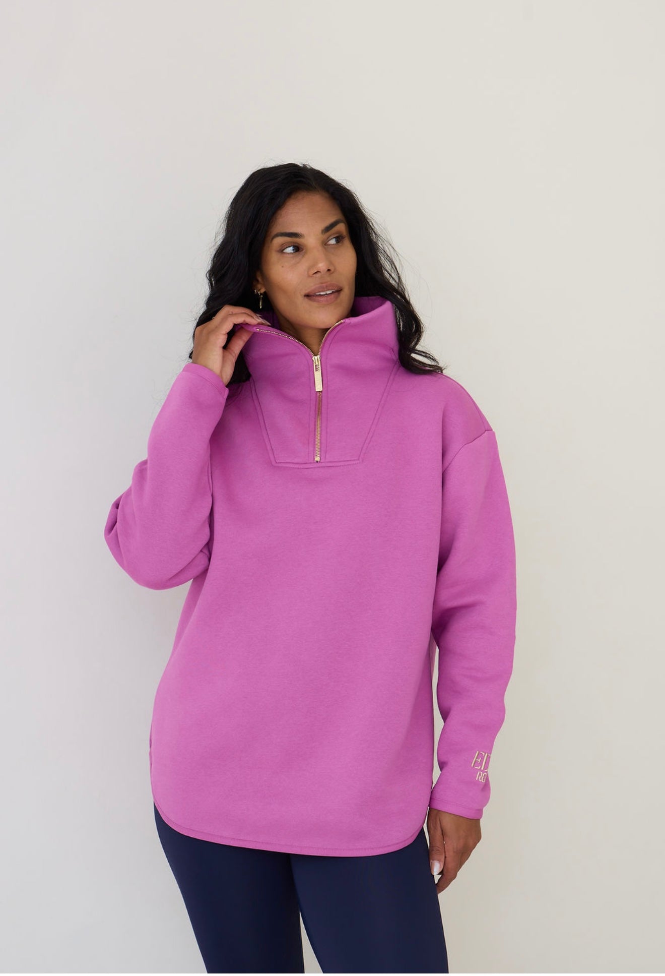 The Elle Funnel Neck reimagines relaxed refinement with its ultra-soft cotton construction, offering cloud-like comfort and timeless design. Anchored by a branded gold zip that glides smoothly along the front, the half-zip fastening allows for adjustable styling, while the high collar funnel neck adds a sleek, modern edge.
