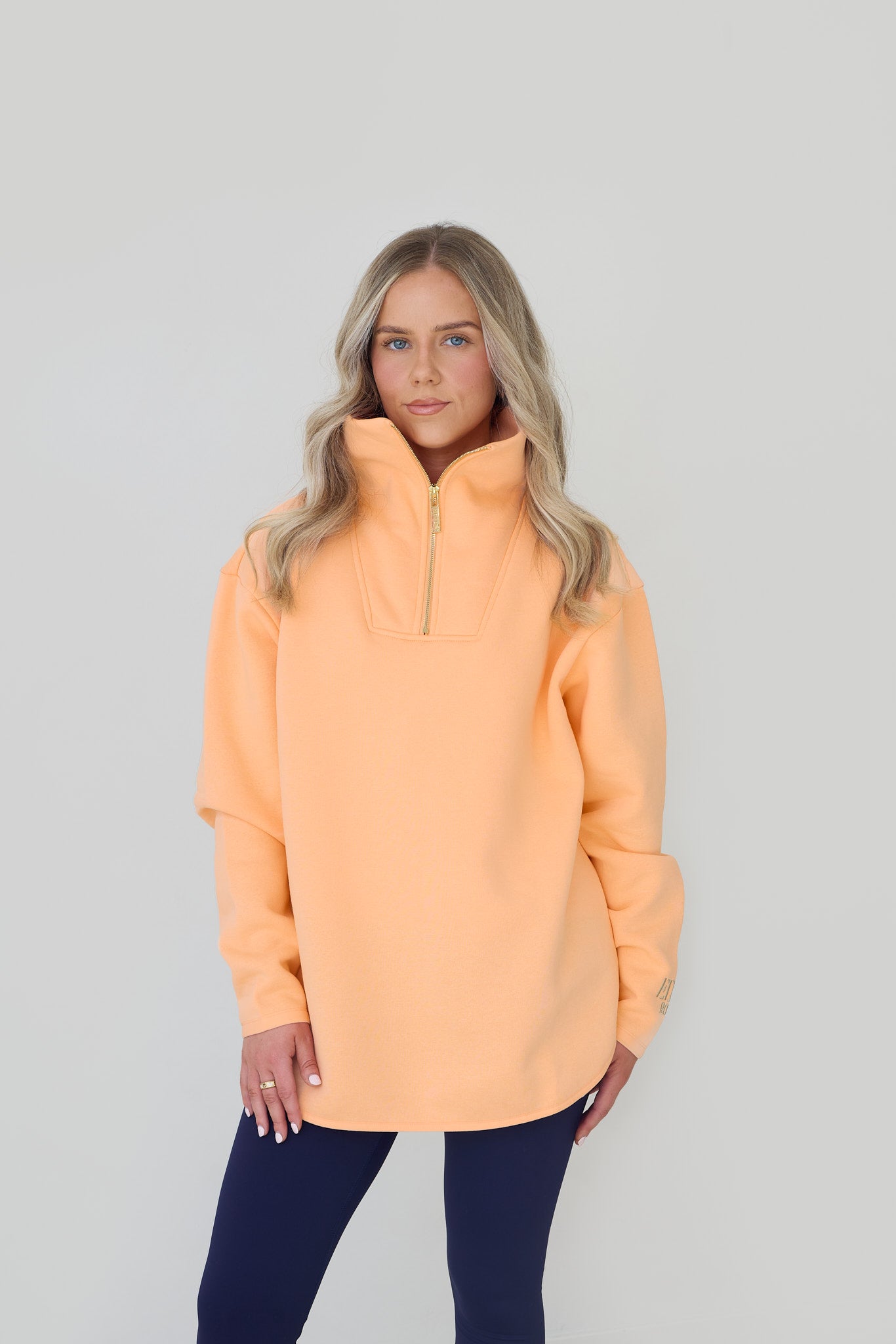 The Elle Funnel Neck reimagines relaxed refinement with its ultra-soft cotton construction, offering cloud-like comfort and timeless design. Anchored by a branded gold zip that glides smoothly along the front, the half-zip fastening allows for adjustable styling, while the high collar funnel neck adds a sleek, modern edge.