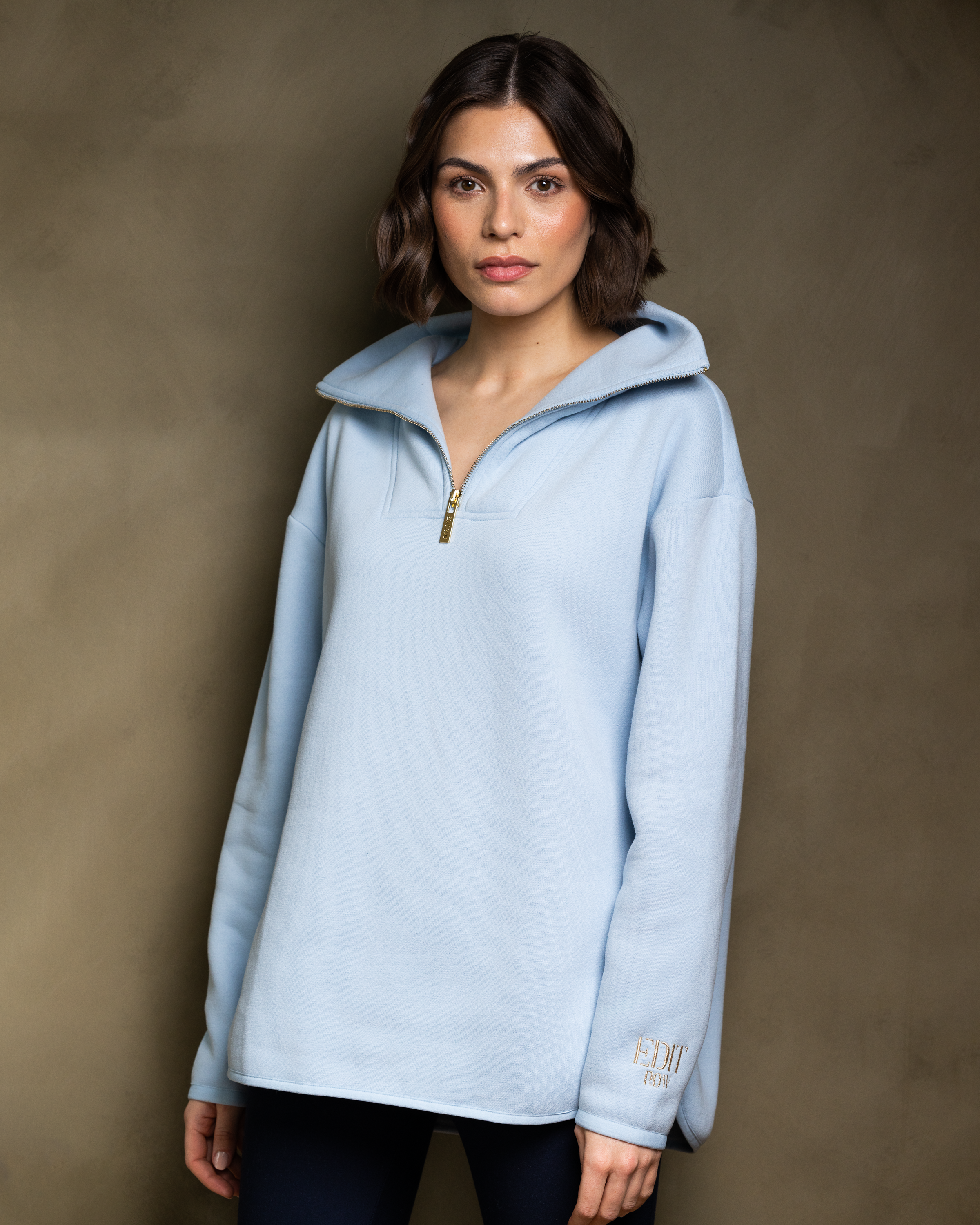 The Elle Funnel Neck reimagines relaxed refinement with its ultra-soft cotton construction, offering cloud-like comfort and timeless design. Anchored by a branded gold zip that glides smoothly along the front, the half-zip fastening allows for adjustable styling, while the high collar funnel neck adds a sleek, modern edge.