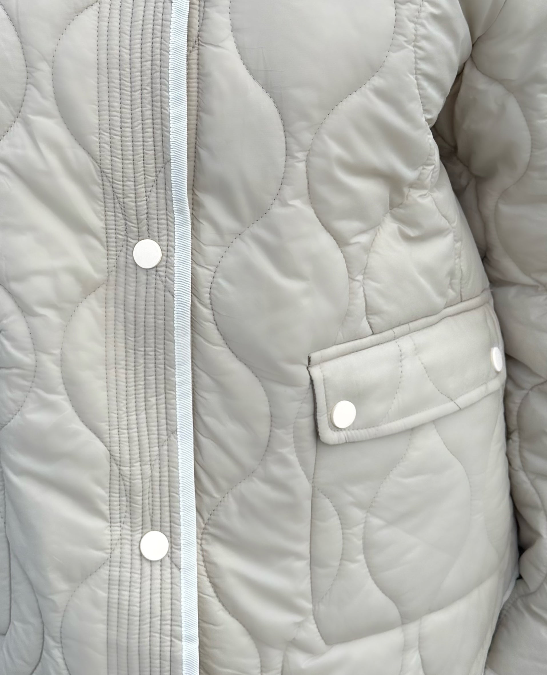 Crafted from 100% nylon, it features light padding for just the right amount of warmth — perfect for those in-between seasons. The round neckline, snap button closure, and tape trim detailing at the opening, cuffs, and hem give it a clean, modern finish, while front pockets add both function and ease.