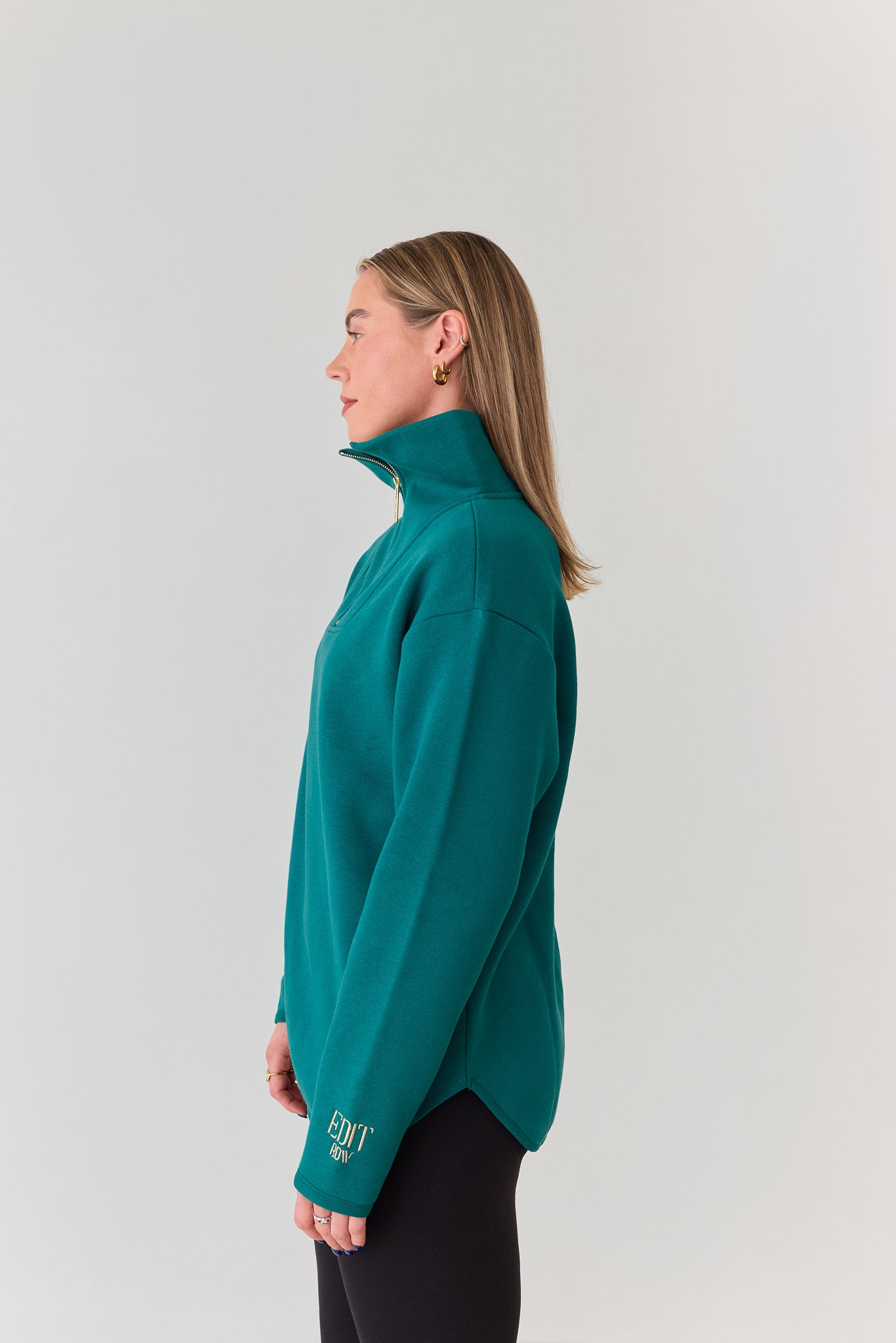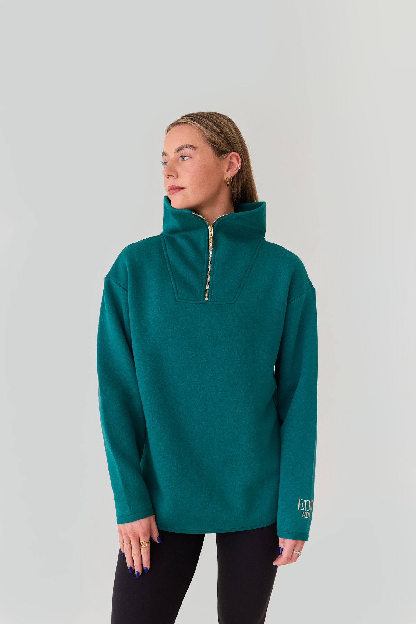 The Elle Funnel Neck reimagines relaxed refinement with its ultra-soft cotton construction, offering cloud-like comfort and timeless design. Anchored by a branded gold zip that glides smoothly along the front, the half-zip fastening allows for adjustable styling, while the high collar funnel neck adds a sleek, modern edge.