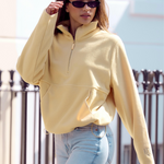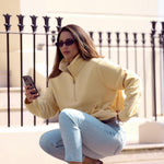 It features a sleek half-zip funnel neckline and a relaxed silhouette that flatters every figure. Thoughtful pocket details on either side add both function and style, while adjustable gold hardware drawstrings at the hem allow you to customise the fit to your mood — structured and cinched or easy and relaxed.