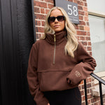 It features a sleek half-zip funnel neckline and a relaxed silhouette that flatters every figure. Thoughtful pocket details on either side add both function and style, while adjustable gold hardware drawstrings at the hem allow you to customise the fit to your mood — structured and cinched or easy and relaxed.