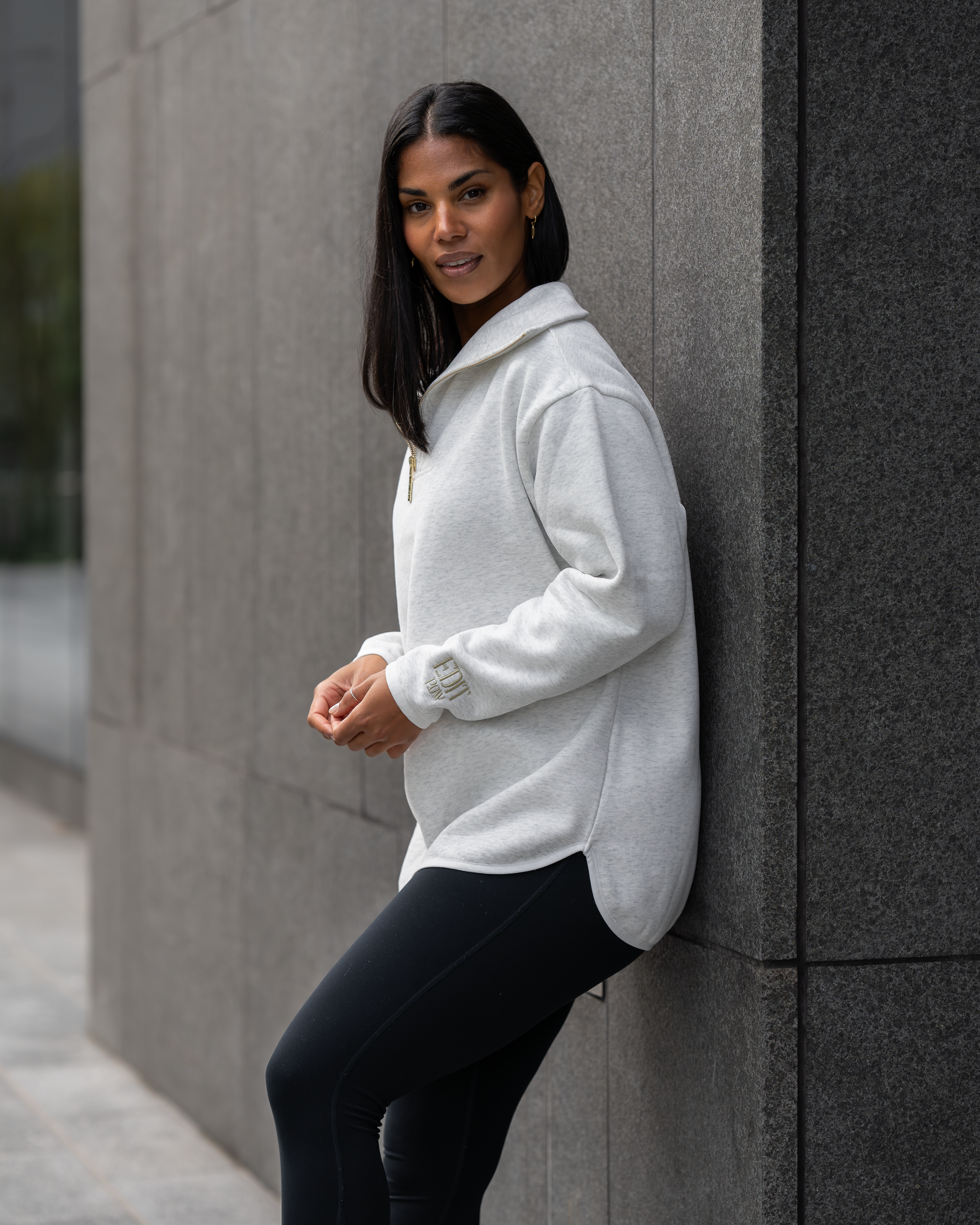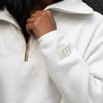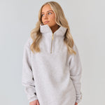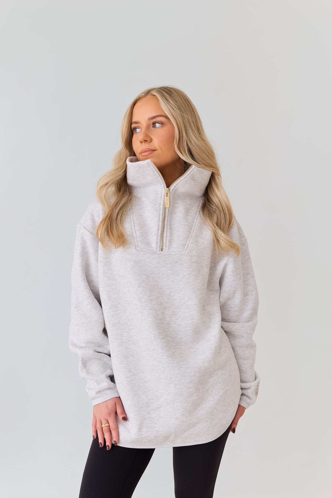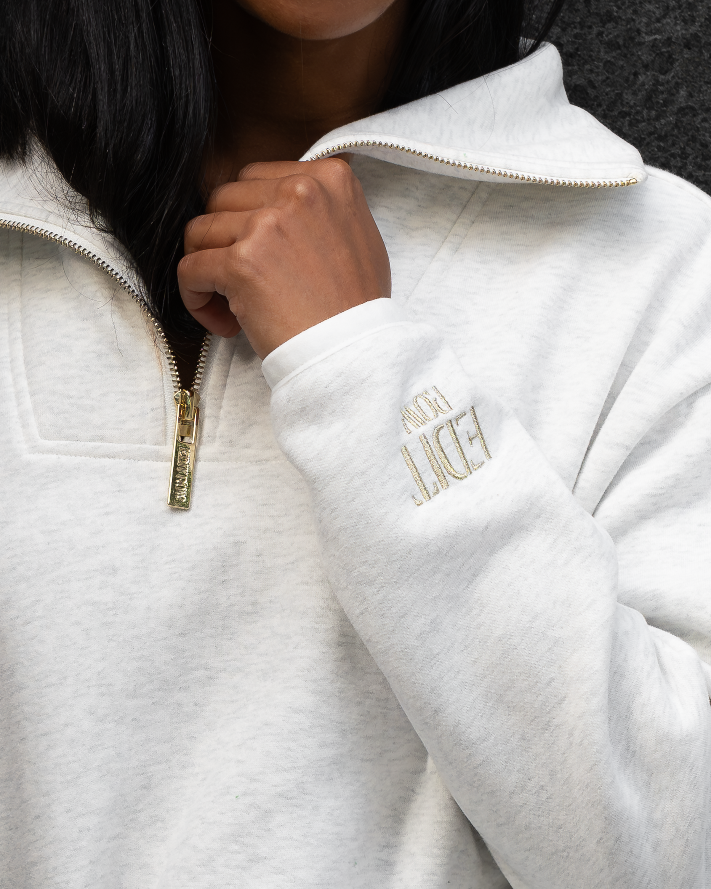 The Elle Funnel Neck reimagines relaxed refinement with its ultra-soft cotton construction, offering cloud-like comfort and timeless design. Anchored by a branded gold zip that glides smoothly along the front, the half-zip fastening allows for adjustable styling, while the high collar funnel neck adds a sleek, modern edge.
