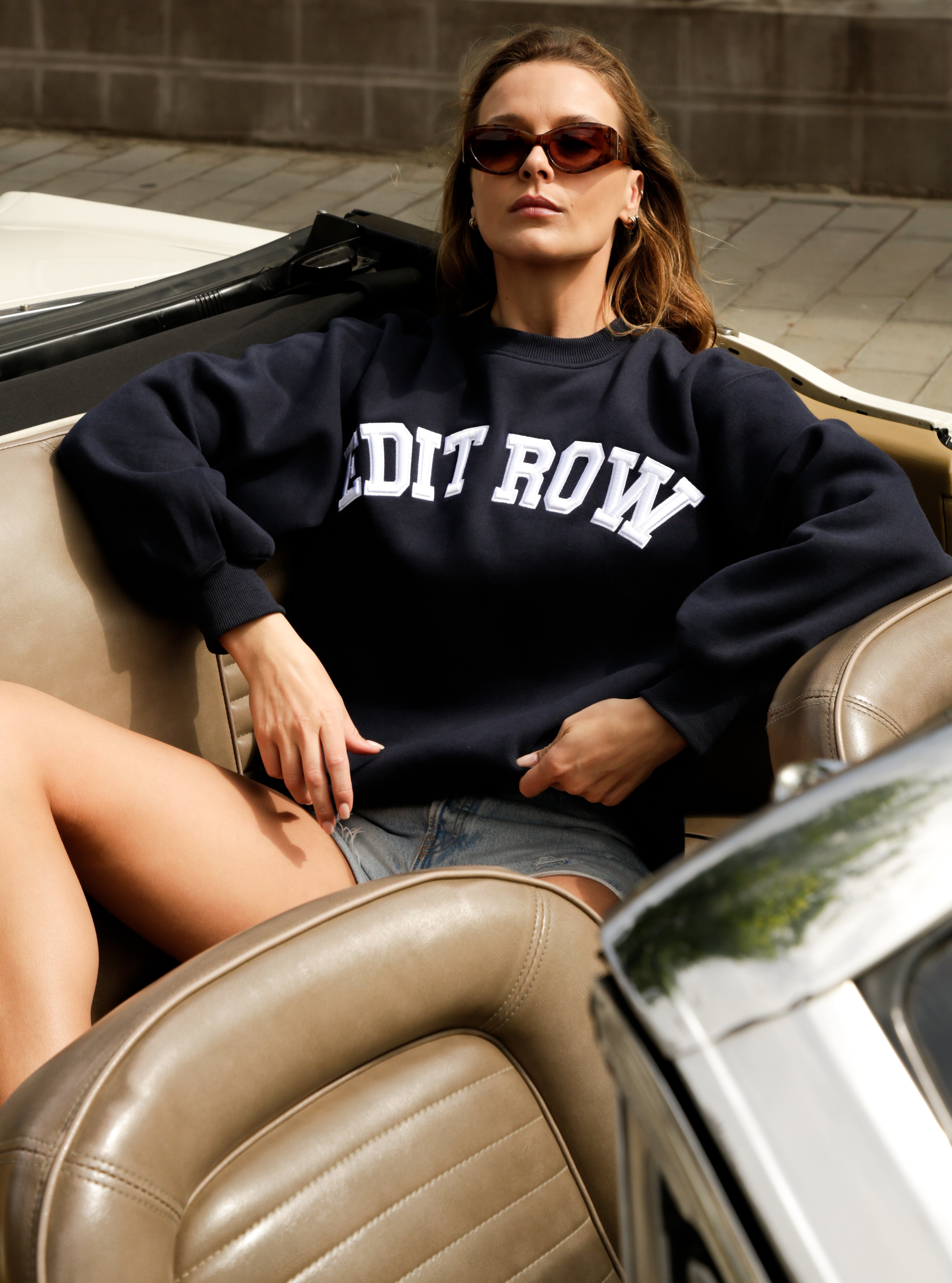 Upgrade your wardrobe with our Varsity Navy Collegiate Crew! Made from soft cotton and brushed fleece underlining, this stylish piece boasts a bold 3D embroidered logo and can be dressed up with denim or paired with our Edit Row leggings for a casual, sporty look. Comfort and style all in one!