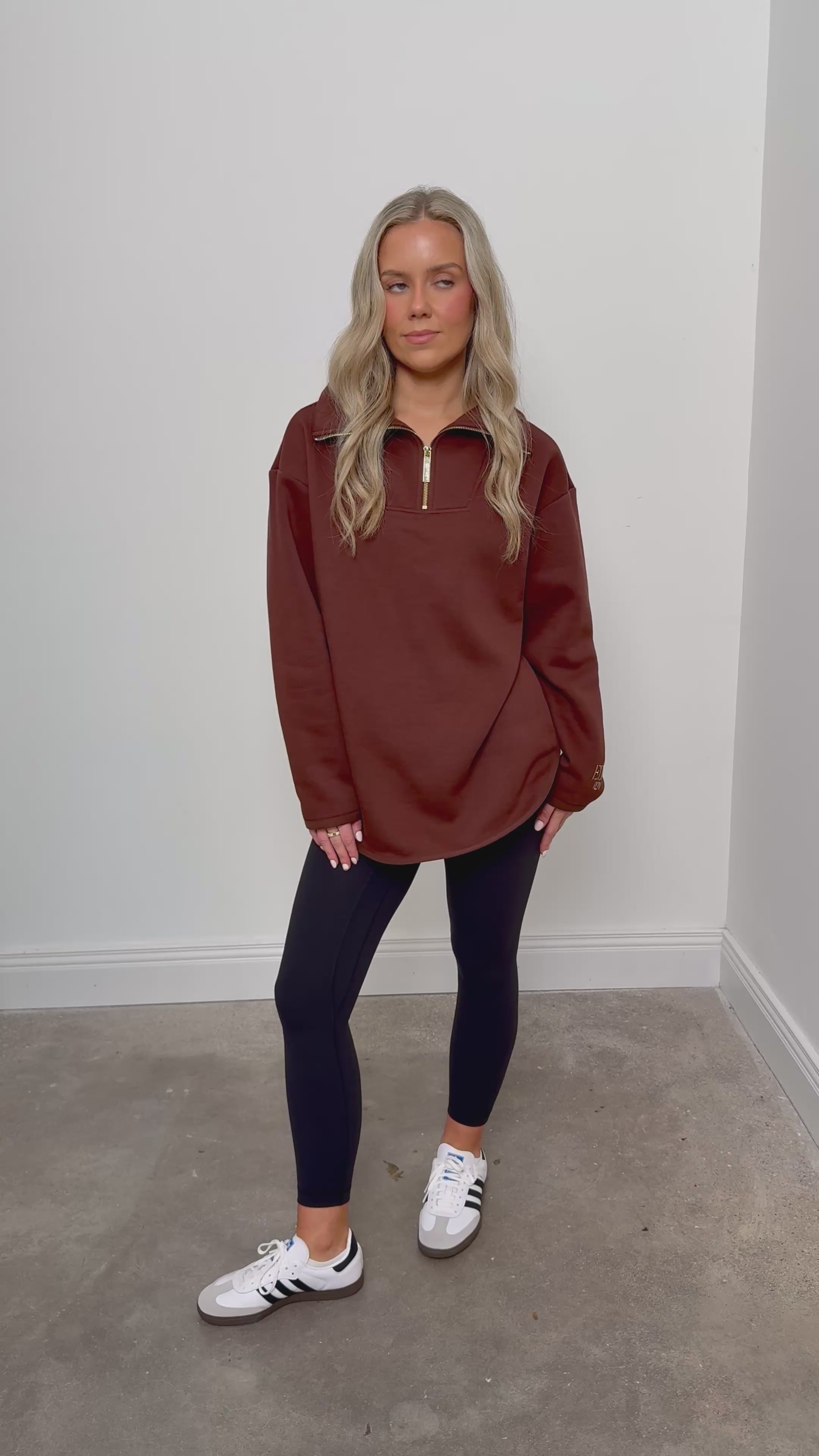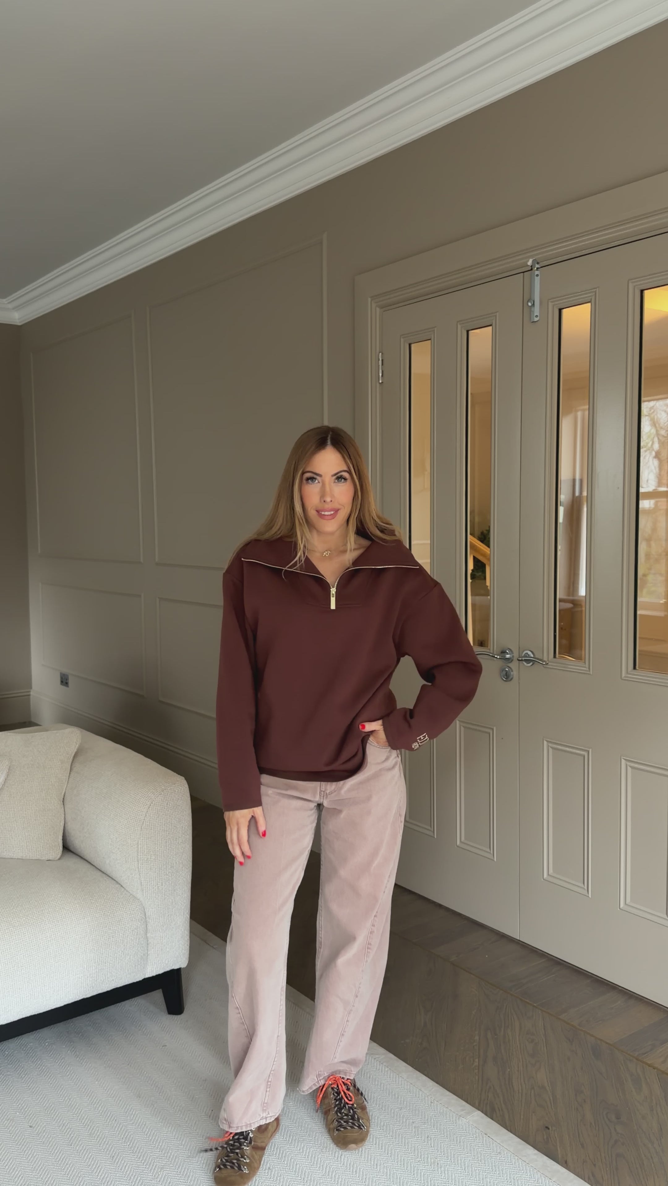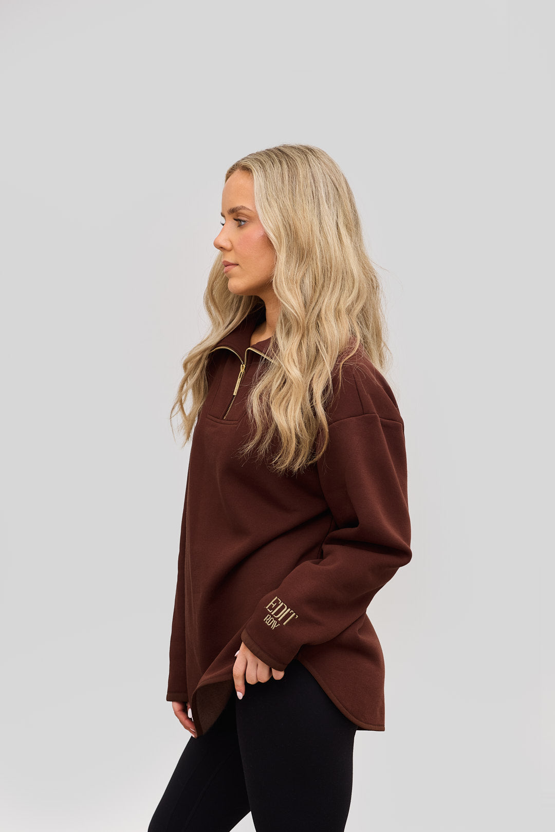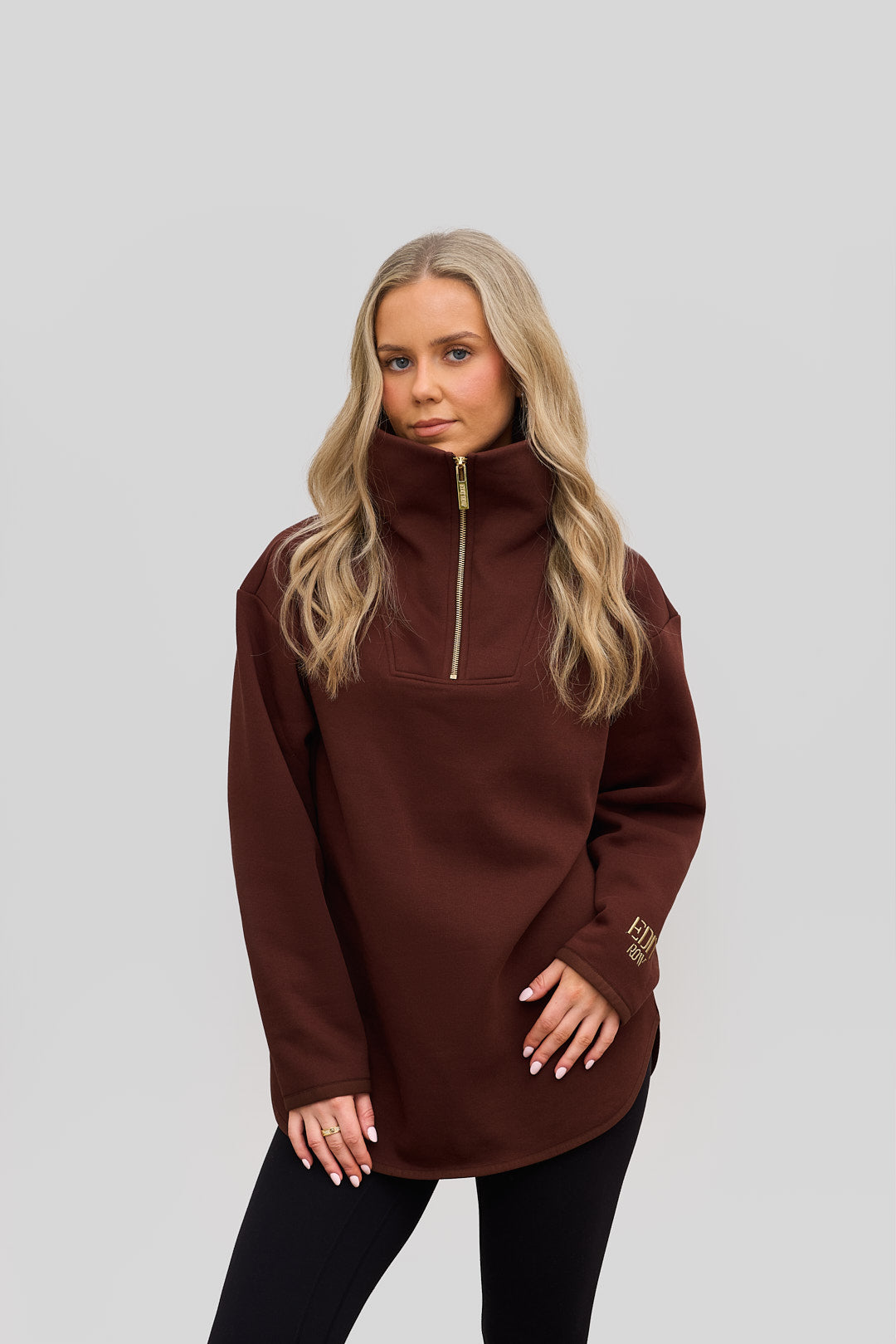 The Elle Funnel Neck reimagines relaxed refinement with its ultra-soft cotton construction, offering cloud-like comfort and timeless design. Anchored by a branded gold zip that glides smoothly along the front, the half-zip fastening allows for adjustable styling, while the high collar funnel neck adds a sleek, modern edge.